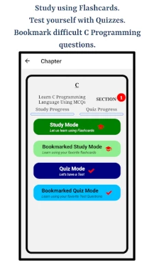 This app is a great resource to learn about C Programming Language. The app is engineered to make users perfect understanding common C Programming Language questions by studying for a very short amount of time. Audio functionality and bookmarking is available throughout the app on chapter, section, study mode and quiz modes.