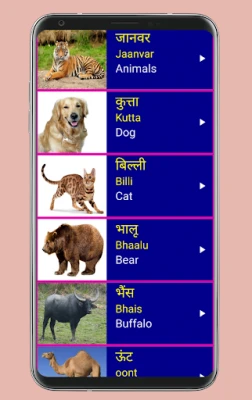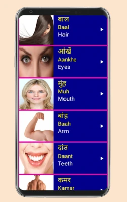 2. Each Hindi word has a clear image 📸🖼️ and audio pronunciation 🎵🔊 to make Learning Hindi via English Easy.