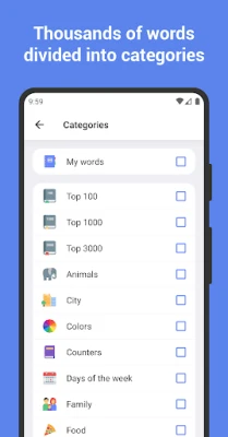 • 5000 words vocabulary. Thousands of Korean words and phrases divided into thematic categories: choose the category you want to learn this time and change it whenever you want.