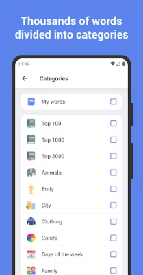 • Built-in dictionary contains thousands of Russian words and phrases divided into categories. It includes the most frequently used Russian words, as well as some other thematic topics.