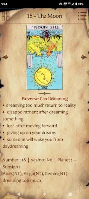 Learning Tarot Cards app is for learning the basics about tarot cards. Tarot cards is pack of 78 cards, similar to playing cards. Tarot cards are used to predict future. It can also tell past and present of someone. This app has images of all tarot cards. The used images are traditional old card pictures called Universal Cards. The app contains information about those cards. The meaning behind the picture on card and what the card means when it comes in your future prediction. The cards also have different meanings when they are reversed, that meaning is also covered in app. Along with that it does have the information about planets, sun signs, numeric values assigned to the cards.