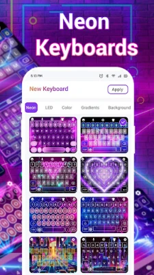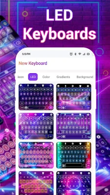 With Led Keyboard: RGB Keyboard App, explore a variety of stylish keyboard themes like Neon, LED, Colorful, and Gradient Backgrounds. These trendy keyboard themes let you design a unique typing experience that fits your mood.