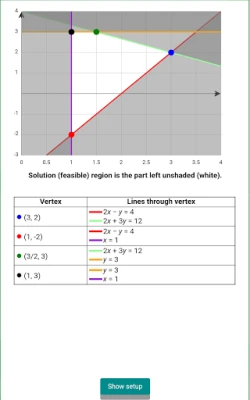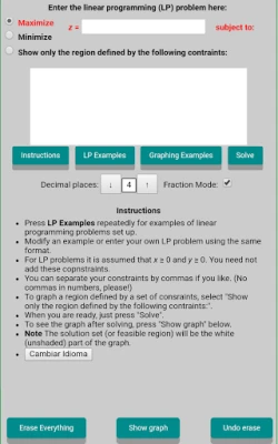 Graphs and solves, showing the feasible region, corner points, and optimal solution. Just type in any linear programming problem and press "Solve." Check your simplex method homework in a snap!