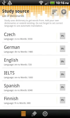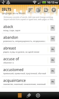 Import words from everywhere, translate them on the go and learn with the help of four different study types. It is easy to open web site or book on desired language and import all content to your own dictionary. Automatic translation protects you from manual searching and typing. Study reminder helps you to build your own schedule.