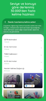 - Konuya göre öğrenme: Kişisel ihtiyaçlarınıza uygun olarak iş, seyahat, akademik veya günlük yaşam gibi yüzlerce farklı konu arasından seçim yapın.