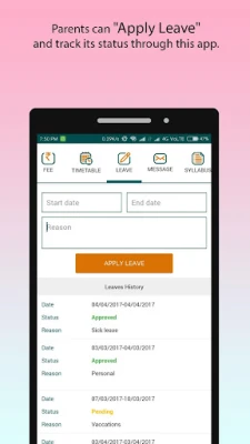"Fees" this module will give parents automatic reminder a day prior to fees submission day. Parents can also all the transaction history through this app.