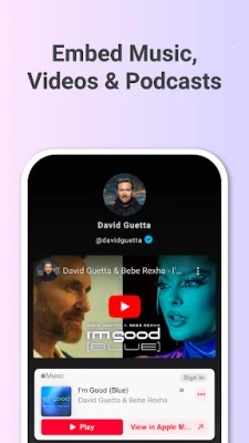 Müzik parçalarını ve videoları doğrudan Lnk.Bio sayfanıza entegre edebilirsiniz. Takipçileriniz başka bir siteye yönlendirilmeden eksiksiz ve sorunsuz bir deneyim yaşayacak.