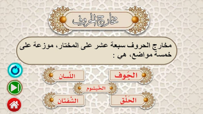 بطريقة سهلة و مفصلة يحتوي البرنامج على امثلة منوعة وبالصوت مناسب للكبار وللأطفال حيث ان البرنامج مقسمة احكام التجويد فيه الى قسمين ومصممة على شكل دائرتين تضم كل منهما جزء من الاحكام يحتوي التطبيق على قسم خاص لمخارج الحروف يوجد داخل البرنامج روابط لبرامجنا جزء عم وتعلم الصلاة والوضوء