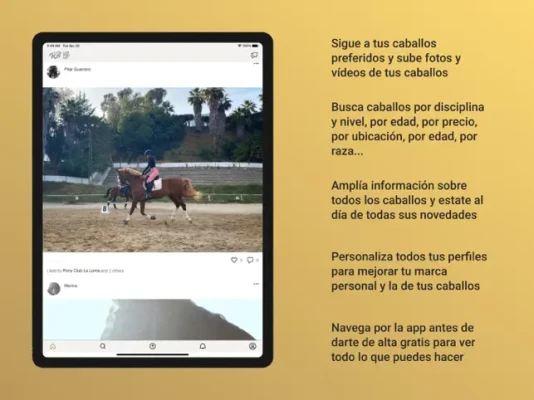 Follow your favorite horses. Search by specialty, level, location, age ... Upload photos and videos of your horses and give them visibility.If you like horses, what are you waiting to be at Luxequus!