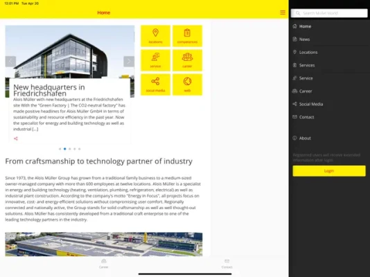 Müller World is the informative communication app of the Alois-Müller-Group. Alois Müller is a specialist in power engineering, building services (heating, ventilation, sanitary, refrigeration, electrical systems) and plant engineering.