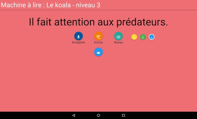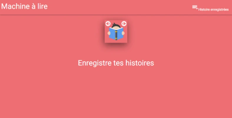 Pour les 6/7 ans. La machine à lire va permettre de travailler la lecture à haute voix. À l’ouverture de l’application, plusieurs histoires sont proposées. Il faut cliquer sur l’histoire choisie. Une histoire va être racontée, cette histoire est personnalisable. À 3 moments, le conteur fera une pause. Une phrase apparaîtra alors. Il s’agira de la lire et de l’enregistrer. Si la phrase est trop difficile ou trop facile, un bouton « niveau » permet de changer de niveau de difficulté. À la fin, l’histoire personnalisée avec les enregistrements pourra être écoutée, sauvegardée et partagée.