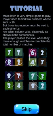 Make It Ten is a very simple game. The player needs to find two numbers that add up to 10. But the two numbers must be next to each other, i.e. in a row, column, diagonal, as shown in the screenshot. The player passes the level when they make enough matches to complete the total number of matches.