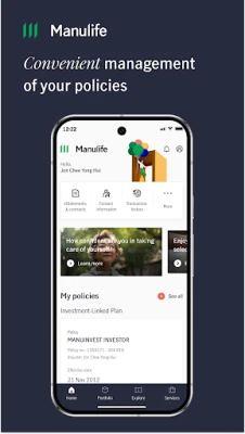 Access and manage your policies effortlessly with the Manulife Singapore mobile app, no matter where you are: • Enable biometric authentication for a fast, secure login experience. • View, update, and manage your policies with ease. Access a variety of online services to retrieve policy documents, manage funds, adjust premium preferences, and more. • Update your personal details anytime. • Access curated insights to empower your financial journey. • Receive timely alerts about your policies, payments, and transactions.
