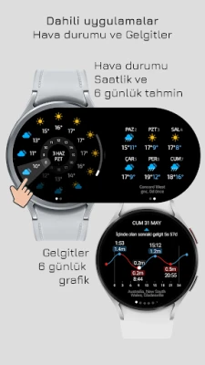 • Hava Durumu: Saatlik tahmini dairesel bir formatla gösterir. Tahmini kaydırabilirsiniz (aydınlatılmış alanı basılı tutun ve döndürün). Sonraki ekranda 6 güne kadar tahmin gösterilir.