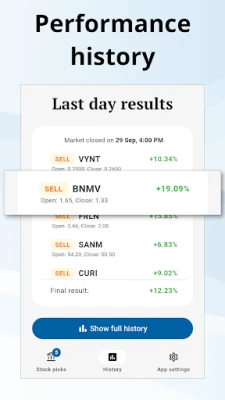 Furthermore, the app provides a feature that allows users to access the performance history of all the stocks that it has previously selected. This allows users to track and evaluate the accuracy and effectiveness of the AI model's predictions over time.