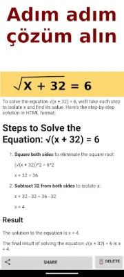 - Kullanışlı arayüz: Görevin fotoğrafını çekin ve birkaç saniye içinde adım adım çözüme ulaşın.