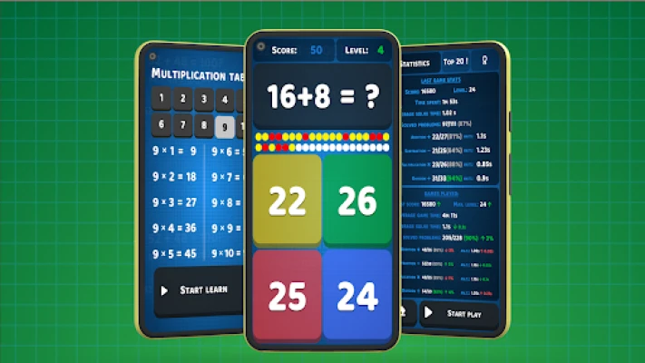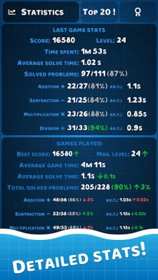 In Game Mode you will have to show all your arithmetic skills and times tables to solve math problems on addition, subtraction, multiplication and division. Any mathematical game trains arithmetic skills. But when the time to solve problems is limited, this skill rises at a higher level. The more math problems you solve, the more difficult are new problems. After every math game you will see detailed statistics table with your math skills data. Or you can compare your results with worldwide math leaders.