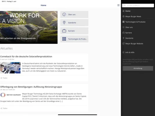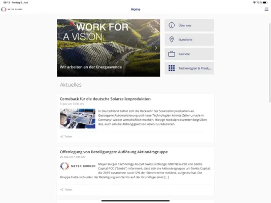 • News: stay up to date with the latest news. With push notifications, you can immediately see what's exciting in the world of Meyer Burger Technology. • Current information about career opportunities • Meyer Burger employees have the option of always being up-to-date. • Events: Use the platform for interactive preparation for our trade fairs and events.