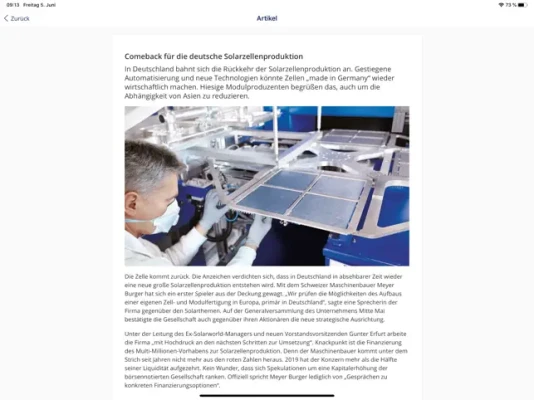 MBLive is the global communication app from Meyer Burger Technology AG, a market leader for solar technology worldwide. In this app we compile the latest news about renewable energies and solar power. This service is aimed at our customers and partners, at our employees worldwide and at everyone who is interested in solar energy and the technology behind it. Stay in touch with us and learn more about the world of Meyer Burger!MBLive offers you the opportunity to stay informed about current events, interesting projects, dates and much more about Meyer Burger - mobile, fast and up to date.