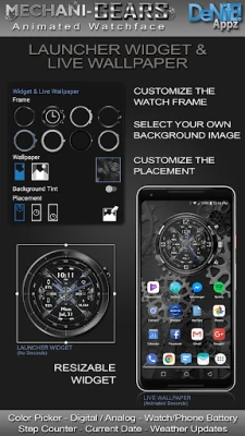 This completely customizable interactive HD Wear OS Watch Face, Clock Widget & Live Wallpaper brings a classic elegance to your wrist and Launcher. Features include custom complications, battery levels, weather conditions, step counter, color picker & date information. A settings app will also be installed on your mobile device to configure the watch face for any look you desire. Select any color and create a completely custom look for yourself! Don't have a Wear OS watch? No Problem! You can use the clock widget or Live Wallpaper on your launcher!