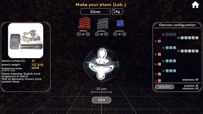 In the interactive laboratory you can assemble any atoms, and study the structure of their electron orbitals. Assemble any molecule and see how they take shape. Learn the difference between the structural and skeletal formula. Look at the real position of atoms in a molecule and the bonds between them.