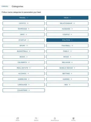 MEME PREFERENCE You can select topics of interest to customize your feed with related memes by clicking the plus icon on top right, click on feed preferences and select topics of interest.