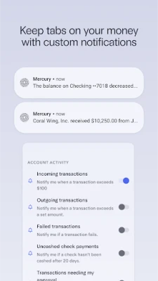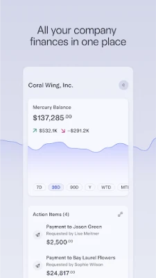 • See your total balance across all your accounts • Track all company transactions • View your cash flow • Work across your linked Mercury organizations • Deposit checks in seconds • Move money between accounts • Manage your credit cards, debit cards, and spending