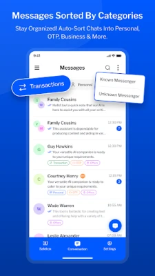Our intelligent SMS Organizer automatically categorizes your text messages into Personal, Transactions, OTPs, and Promotions. This Smart Messaging application ensures your most important messages stay front and center.