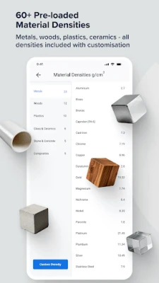 🧱 Choose from 60+ variety of materials including Metals, Woods, Plastics & more with pre-loaded densities to simplify your calculations.