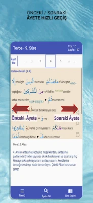 Kur'ân'ın kelime meâlinin yanında, isteğinize bağlı açılıp kapatılabilen Cümle meâlleri, Âyetin Gramer tahlîli ve kelime kök harfleri, Anahtar Kelimeler, Meâllerde arama, Âyete kişisel Not Ekleme, Etiket Koyma gibi özellikleri içermektedir.