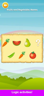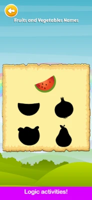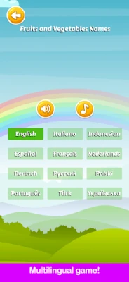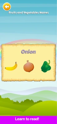 Çocuklar için dili anlamaya ve yeni kelime dağarcığı edinmeye yardımcı olan eğitici oyunlarla meyve ve sebzelerin adını öğrenmek için uygulama.