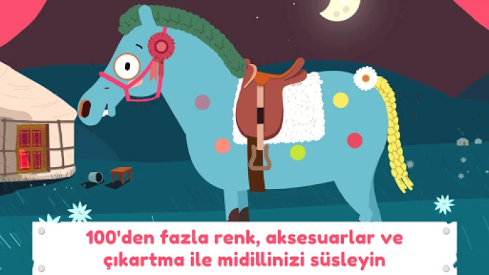 Yaratıcılığınızı konuşturun! Farklı renkler ve aksesuarlar kullanın, saç spreyi, tırnak boyası ve çıkartmaların yanı sıra saç tokaları, yıldızlar, kalpler ve dizginler ekleyin. Son olarak en yaratıcı ve muhteşem midillinizi size ait galerinize kaydedin.