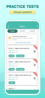 - Continuously updated tests for all levels, ranging from TOPIK one to TOPIK two