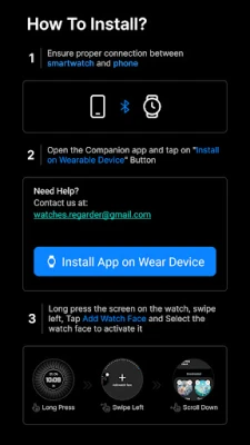 1. On your Wear OS smartwatch, open the Google Play Store. 2. Search for "Regarder Minimal Black" and select the app from the search results. 3. Tap "Install" to begin the installation process. 4. Once the installation is complete, you can find the watch face in the "Watch Faces" section of your smartwatch's settings. 5. Select Regarder Minimal Black as your active watch face.