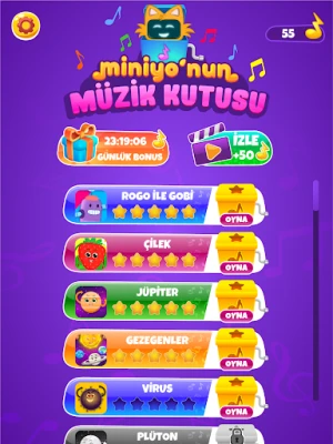 Miniyo'nun Müzik Kutusu oyunu yayında! Miniyo nun sevilen şarkılarıyla müzik yeteneğini keşfetmeye hazır mısın? Müziğe eşlik et, ritmi yakala, puanları kazan. Miniyo ile eğlenceli bir yolculuğa hazır ol!