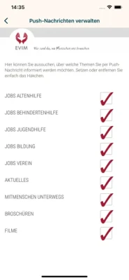 Die App des Evangelischen Vereins für Innere Mission in Nassau - EVIM - bietet schnellen Zugang zu Jobangeboten, zur Ausbildung und zum Freiwilligen Engagement in den Arbeitsfeldern: Altenhilfe, Teilhabe, Jugendhilfe, Bildung und Serviceangebote. Schneller näher dran sind Sie auch über das Modul Direktkontakte an über 60 großen sozialen Einrichtungen und Angeboten von EVIM in Hessen und Rheinland-Pfalz und an News über unsere Arbeit. Außerdem bietet der Marktplatz in der App schnellen Zugang zu unseren Dienstleistungen.