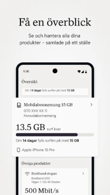 - se hur mycket mobildata du använt - se information om dina fakturor - få översikt över dina abonnemang - se information om och delbetalningar av hårdvara - köp extra datamängd - byta abonnemang