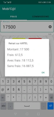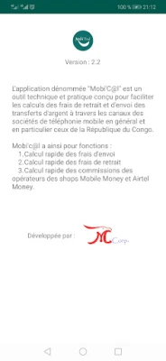L'application dénommée "Mobi'c@l" est un outil technique et pratique conçu pour faciliter les calculs des frais de retrait et d'envoi des transferts d'argent à travers les canaux des sociétés de téléphonie mobile en République du Congo. Mobi'c@l a ainsi pour fonctions : Calcul rapide des frais d'envoi, calcul rapide des frais de retrait ,calcul rapide des commissions des opérateurs des shops et kiosques Mobile Money et Airtel Money.