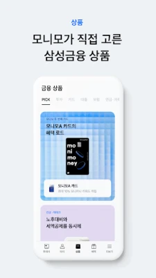 삼성카드 이용내역조회, 삼성생명 · 삼성화재 보험금 청구,삼성증권 주식투자 까지 금융에서 필요한 기능들을 모니모 앱 하나로 이용하세요.