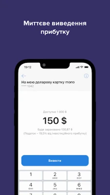Миттєве виведення прибутку Виводьте прибуток із брокерського рахунку на доларову картку миттєво. Податки сплатимо автоматично у момент виведення прибутку.