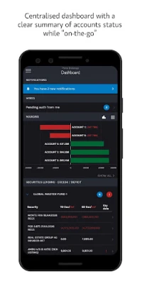 Cash wire summary with approve/reject functionality Centralised dashboard providing a clear and concise overview of key items requiring attention Securities lending excess/deficit summary Margin Summary Screen The app also has 2 factor authentication, including Android Fingerprint Authentication.