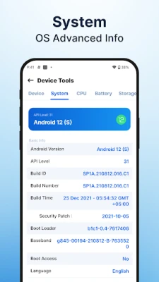 Explore detailed insights into your device’s operating system info for android. View essential system and security info such as Android version and API level. Check language and time zone settings. Keep track of software compatibility for optimal performance.