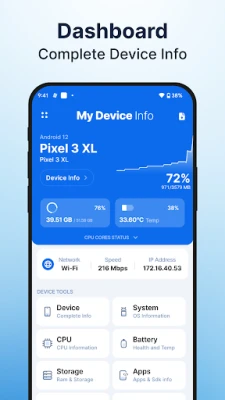 Access detailed information about your device's network connections, including WiFi and mobile data. My phone information app includes IP addresses, connection details, and operator information. This feature helps you stay informed about your network performance and connectivity.