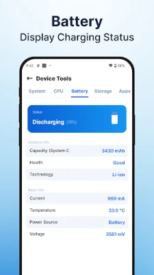 Monitor your battery health in real-time. Get device information on battery status, phone temperature, and level. View about the battery health, technology and voltage. Battery info Check the power source and capacity. Keep an eye on your battery usage and performance.