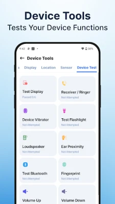 Explore the Device Test feature, allowing users to test various functionalities of their devices. This includes testing the device vibrator, flashlight, loudspeaker and ear proximity sensor.