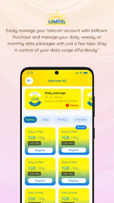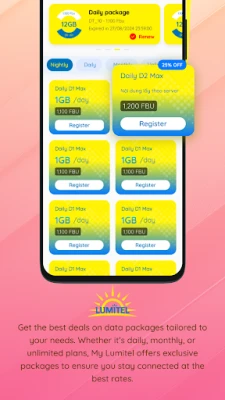 - Self-care: Register for the services package offered by Lumitel, allowing the user to manage their mobile account information, balance, and history charge. Moreover, users can also make top-ups with scratch cards and can get quick support from our user care agencies 24/7