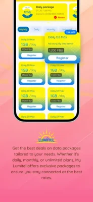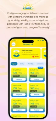- Self-care: Register for the services package offered by Lumitel, allowing the user to manage their mobile account information, balance, and history charge. Moreover, users can also make top-ups with scratch cards and can get quick support from our user care agencies 24/7