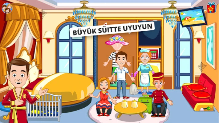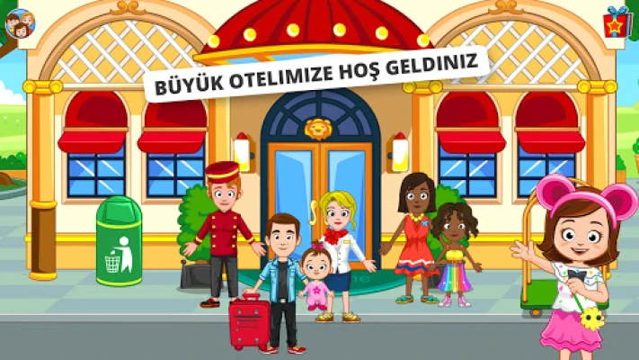 My Town'ın yeni büyük otelinin HER odasında eğlence ve macera var! Balayına çıkanların bavullarını bavul görevlisi taşısın, çocuklar havuzda ve otelin oyun odasında oynasın! En lezzetli meyve suları ile büyük korsan gemisi My Town'un yeni oteli sonunda açıldı!