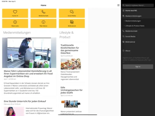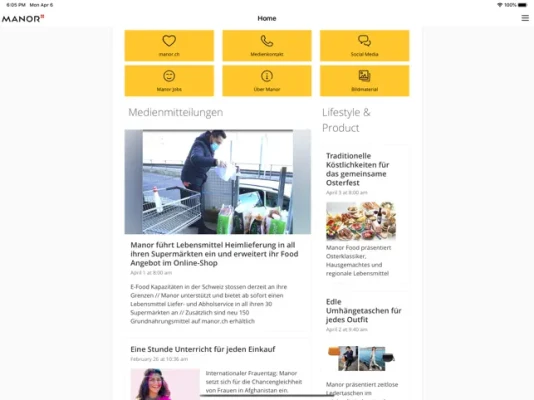 myNews Manor is a centralised application intended for everybody interested in Manor SA. It is designed to be a lively, modern communication platform featuring the latest information about the company and internal news, whilst also offering a forum for exchange, in particular, a noticeboard for displaying adverts. The application is not only suitable for the users of iOS work devices, but can also be made available to all the members of the company, partners or interested people on their personal smartphone on request. myNews Manor needs to be developed and expanded on a permanent basis in order to become a centralised communication and information platform for all those who are interested in Manor SA.