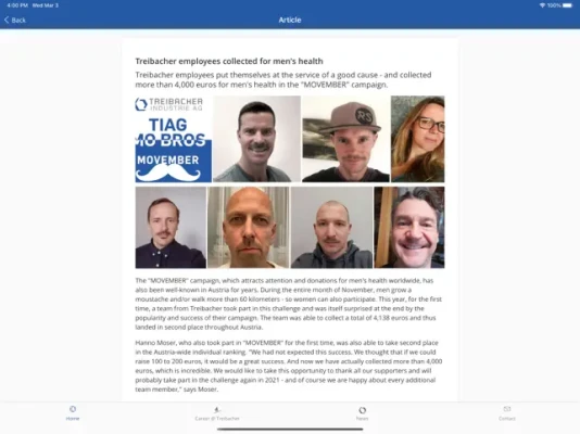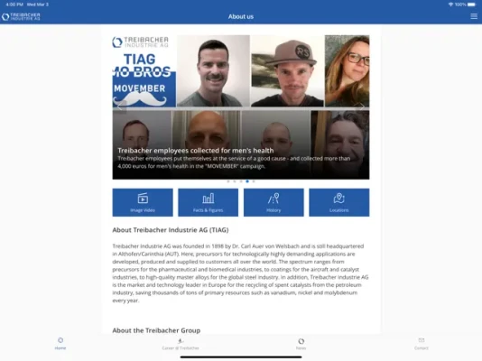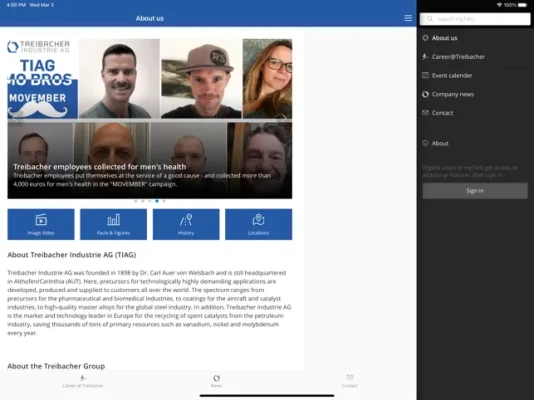 Treibacher Industrie AG is a globally operating industrial company with headquarters (production, sales, research & development) in Althofen/Austria. The myTIAG app offers customers, suppliers, partners and (potential) employees all relevant information and news about the company as well as career opportunities at a glance. Additional features such as an event calendar and a social media wall allow further insights into the company.